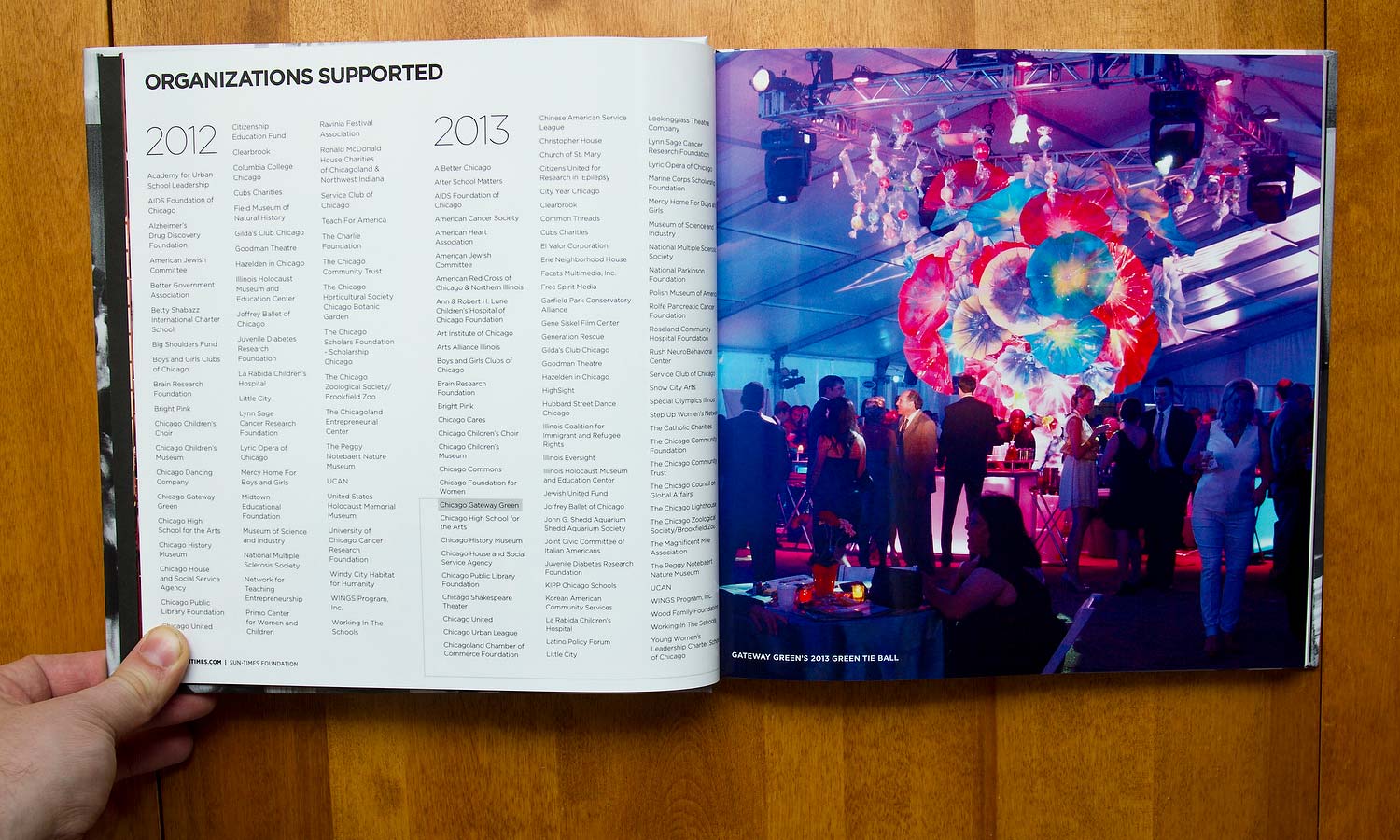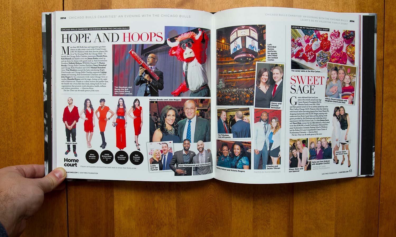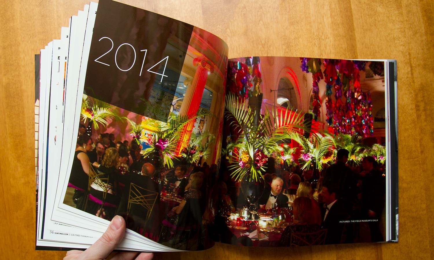 1. Designing a 103-page glossy embossed hardcover book for the Chicago Sun-Times Foundation in Fall/Winter 2015, including hundreds of photos that I shot over four years of covering the biggest philanthropic events in the city.