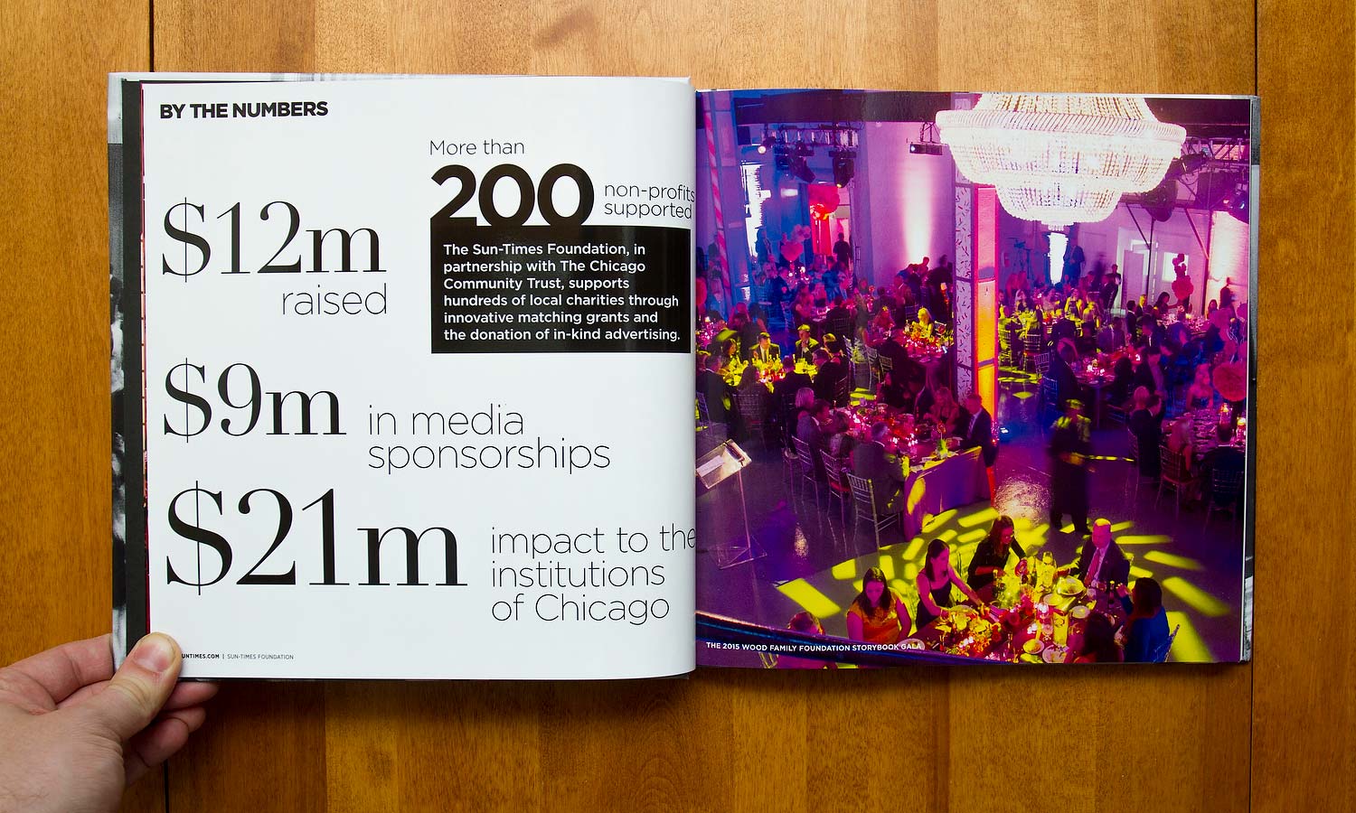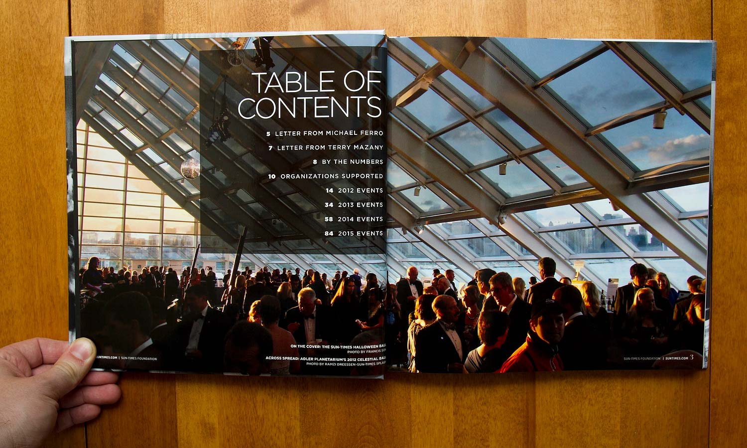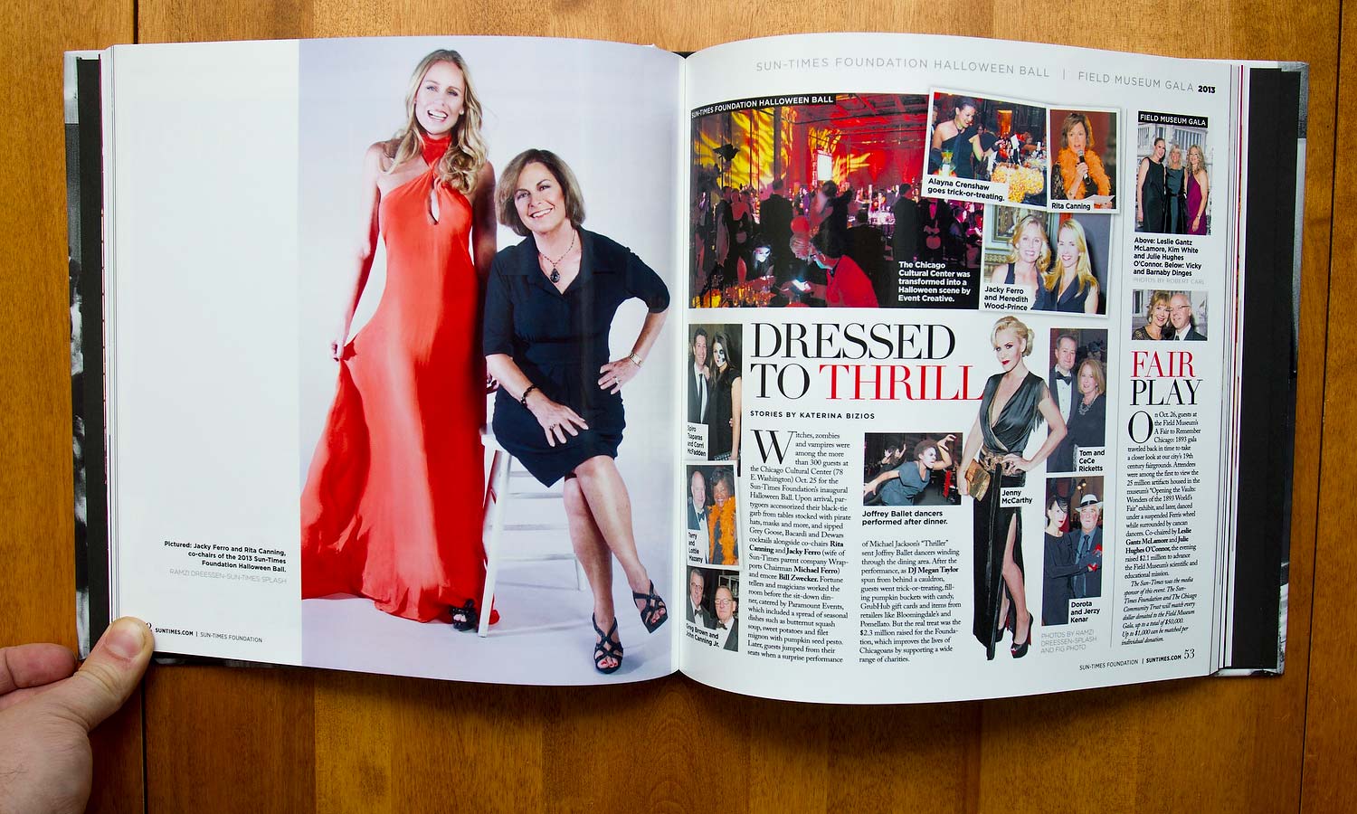 1. Designing a 103-page glossy embossed hardcover book for the Chicago Sun-Times Foundation in Fall/Winter 2015, including hundreds of photos that I shot over four years of covering the biggest philanthropic events in the city.